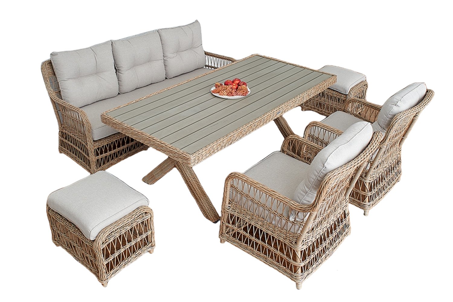 Вся мебель состоит из алюминия, искусственного ротанга и поливуда. Алюминий является каркасом – он не ржавеет и не портиться под влиянием веса. Искусственный ротанг используется для оплетки, вместе с ним для оплетки используется поливуд. Поливуд - современный качественный материал из древесно-полимерного композита, и искусственный ротанг – также синтетическое волокно, которое является заменой настоящего ротанга. Преимущества этих материалов – долговечность и способность противостоять различным погодным условиям. За ними легко ухаживать и чистить.