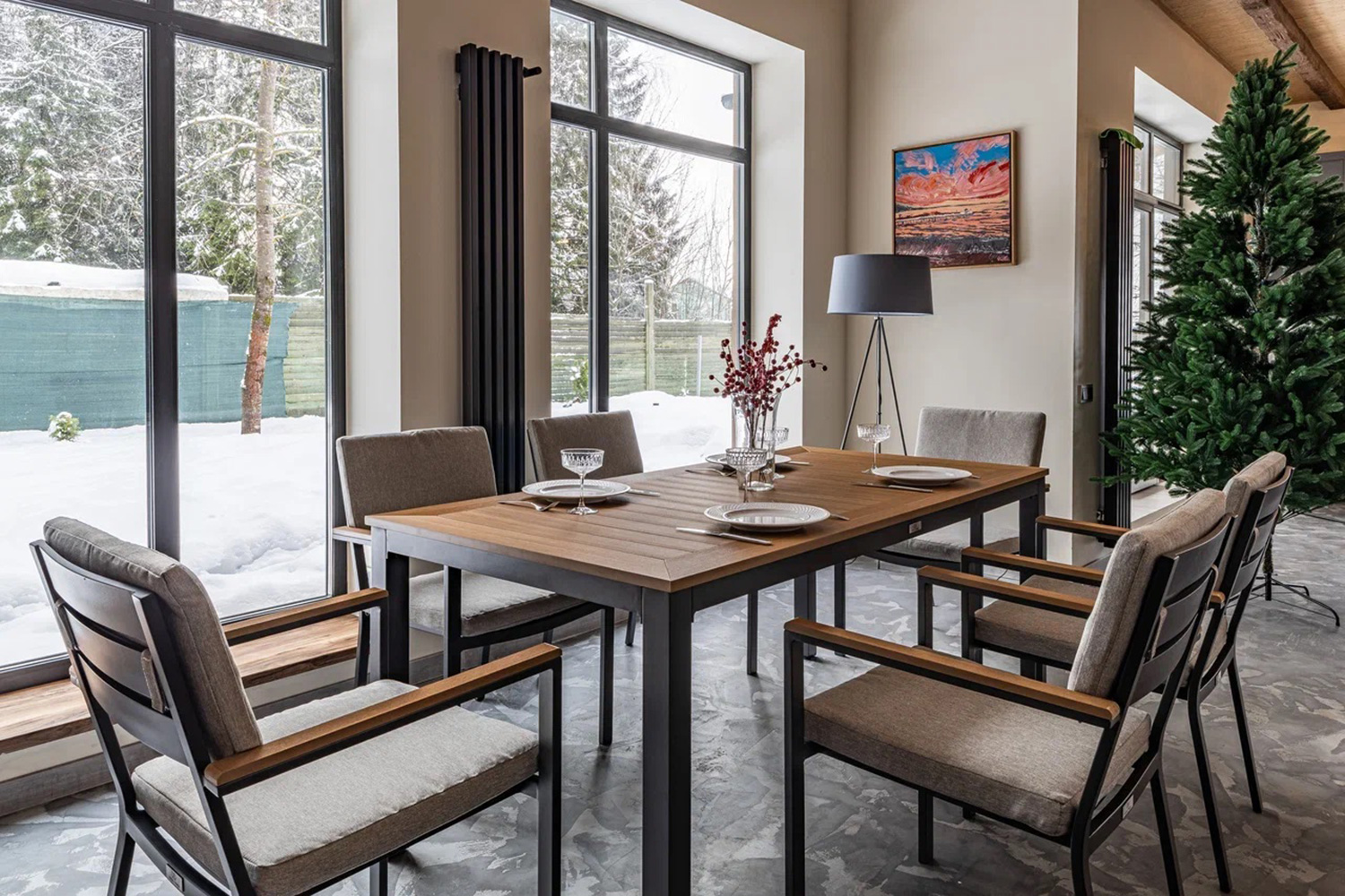 Обеденный стол занимает пространство 180х75х90 см, каждый из стульев – 57х85х62 см. Каркас всей мебели – алюминий, окрашенный в черный цвет. Материал столешницы – поливуд, также синтетический материал, выдерживающий различные нагрузки. Столешницы и подлокотники стульев выполнены в коричневом цвете (сделаны под древесину), столешница имеет покатые углы. Температурный режим от -30 до +50 градусов.
