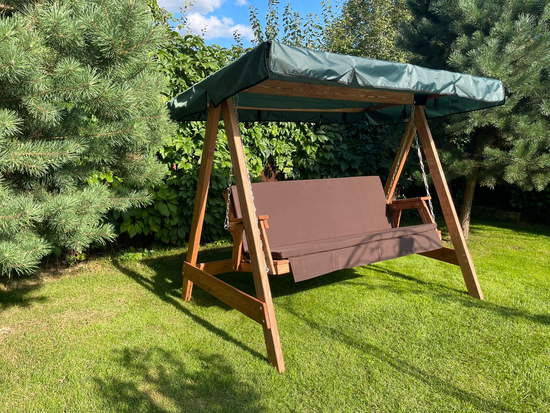 У нас вы можете приобрести матрас коричневого цвета, предназначенный для садовых качелей из дерева. Для изготовления данного матраса использовалась европейская ткань с тефлоновым покрытием, в качестве наполнителя для матраса используется холлофайбер. Длина изделия составляет 155 см, толщина 5 см, глубина сидения 49 см, а высота спинки 55 см.